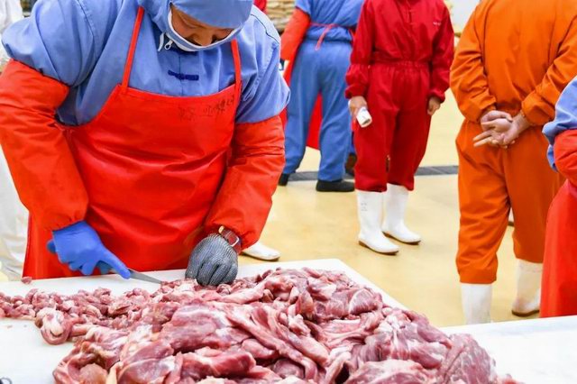 比賽分為兩個項目:小酥肉原料肉切肉比賽和小酥肉包裝比賽。公司屠宰車間、分割車間、調(diào)理品車間、副產(chǎn)車間和熟食車間共派出6支參賽隊伍。小酥肉原料肉切肉比賽每個隊伍時間限定20分鐘,在20分鐘內(nèi)根據(jù)所切肉條的重量和完成質(zhì)量評定名次。鍋圈小酥肉包裝比賽每個隊伍包裝300袋(約80kg)小酥肉,根據(jù)所用時間和包裝合格率評定。比賽開始之前,熟食廠經(jīng)理張沛宣布了比賽的規(guī)則,叮囑參賽選手在比賽中注意安全,隨后比賽拉開了帷幕。