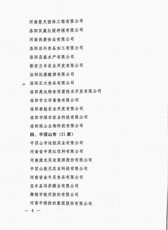農(nóng)業(yè)產(chǎn)業(yè)化省重點(diǎn)龍頭企業(yè)2016.10.24 發(fā)布時(shí)間:2020-01-15來源:洛陽正大食品有限公司點(diǎn)擊:11965 上一篇:出口食品生產(chǎn)企業(yè)備案證明 下一篇:56.河南民營企業(yè)現(xiàn)代農(nóng)業(yè)100強(qiáng)